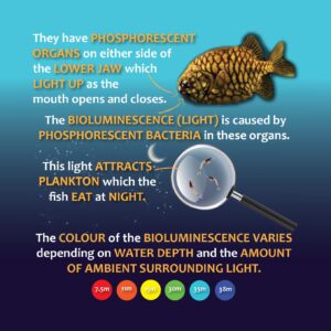 Bioluminescence. Pineapple or pinecone fish have sharp pointy scales and yellow colouration. But this is not the only interesting thing about this fish. They have organs on either side of their lower jaw which light up as their mouths open and close. These organs are filled with light producing bioluminescent bacteria which attract plankton, thus enabling the pineapple fish to feed at night.