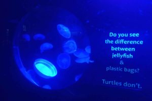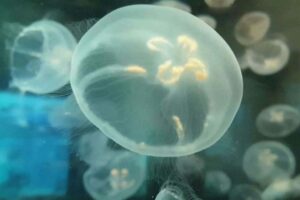 Jellyfish are members of the phylum Cnidaria which includes corals, anemones and bluebottles. Jellyfish are typically bell-shaped and fringed with stinging tentacles. Jellyfish swim by contracting and relaxing muscles at the margin of their bells. By contracting these muscles, they tighten the bottom of the bell which forces water out and propels them forward. Some feed on the organic particles that float around them as they drift through the sea whilst others capture small fish. Jellyfish are an important food source for leatherback turtles, sunfish and beach dwelling scavengers such as plough snails and ghost crabs. The adult stage is called a medusa after the unfortunate woman of Greek mythology who was loved by the god of the sea and as a result had her hair changed into snakes by a jealous goddess.