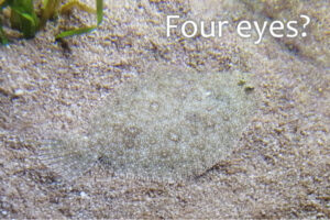 Four Eyes? Are you seeing right? Does this fish have two eyes on the same side of its head or does it have four eyes? Sole are born as tiny round fish with one eye on each side of their body much like all other fish. They are however different from most fish in that during their first two weeks, they begin to change shape and flatten out. For most sole, the left eye moves to the right side of their head and their entire skull is shifted in the process. How does this benefit the fish? Having both eyes located on the same side of their body enables these skilled predators to see and catch their prey whilst remaining camouflaged in the sand