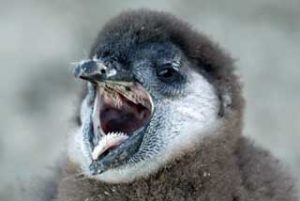 Do penguins have teeth? No. Well not normal teeth. Penguins have papillae, structures on the tongue and palate comprised of soft keratin spikes. They curve backwards toward the back of the mouth and work a bit like a fish hook by grabbing onto a slippery fish and moving the fish down the penguin’s throat!