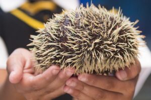 Sea urchins have globular bodies encased in a calcium carbonate shell, which is also known as test, covered with spines. They have five radiating rows of tiny holes through which tube feet project. Did you know that sea urchins have teeth? Yes teeth. Their mouth is located in the centre on the underside and has five massive teeth. Most sea urchins are herbivores and feed on seaweed or microscopic algae. Their teeth are extremely sharp enabling them to scrape of the algae of the rocks. When reproducing, the males and females will release sperm and eggs into the water where fertilization will take place, and the larvae will form part of the plankton cycle until they settle out.