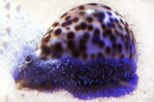 The tiger cowrie is one of the largest species of cowrie. These sea snails can grow up to 15cm in length. Did you know that tiger cowries are nocturnal? Tiger cowries have a mantle which they stretch over their shell as they move about. The mantle serves to repair and protect the cowries shell, often helping to camouflage it amongst its surroundings. However, this doesn’t stop octopus and some fish species feast on them by biting through their shells.
