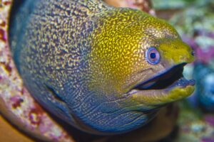 The body of a moray eel resembles that of a snake. Its enormous mouth is lined with rows of sharp, lethal teeth. They have two sets of jaws with teeth that point backwards to prevent prey from escaping. The honeycomb moray eel is the second largest of the moray eel species with a maximum length of 300cm and a weight of 29kg. These animals secrete transparent mucus that forms a protective layer over their skin enabling them to glide through the water. They are nocturnal and generally only hunt at night. Moray eels are carnivorous and prey on shellfish, crayfish, squid, octopus, shrimp, krill, as well as other sea creatures.